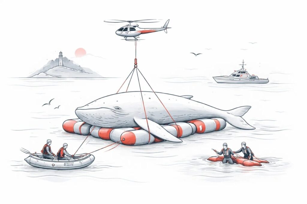Логистическая схема спасения подразумевает использование инновационного метода, минимизирующего давление на внутренние органы животного при подъеме. Вчера в зону проведения работ была доставлена тяжелая техника, включая краны большой грузоподъемности, которые установят понтонную платформу в непосредственной близости от кита.